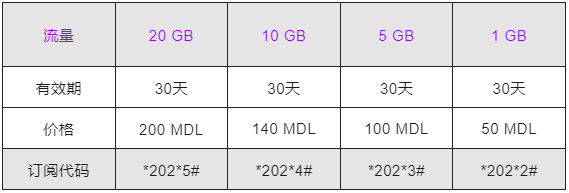 Unite Unite即Moldtelecom 查询余额:拨打*200#,然后选1 购买流量:*200# 或*500#, 也可以发送下表中对应的短信代码到100,进行订阅。